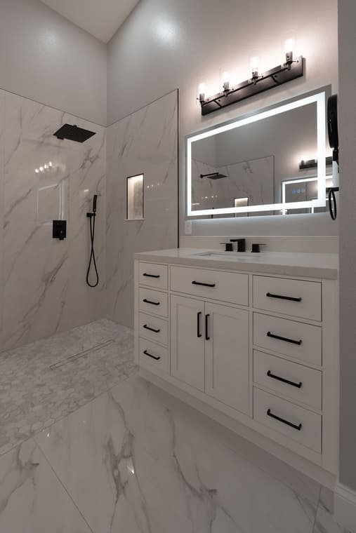This master bathroom remodel delivers a refined, spa-inspired experience with a clean architectural layout and premium finishes. Large-format marble-look porcelain tile, a seamless walk-in shower, and custom double vanity create a space that feels open, elegant, and timeless—designed and built by Fenthus LLC.