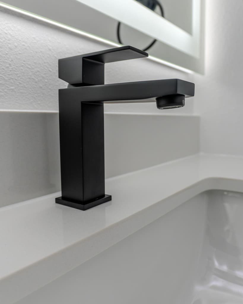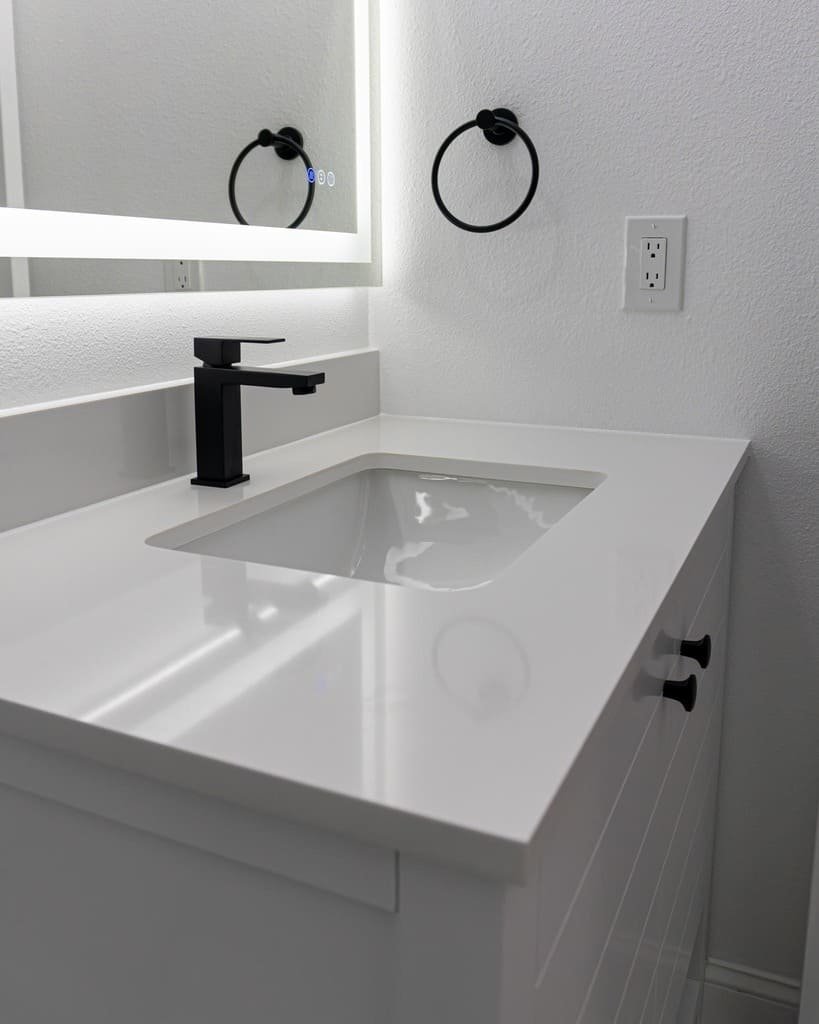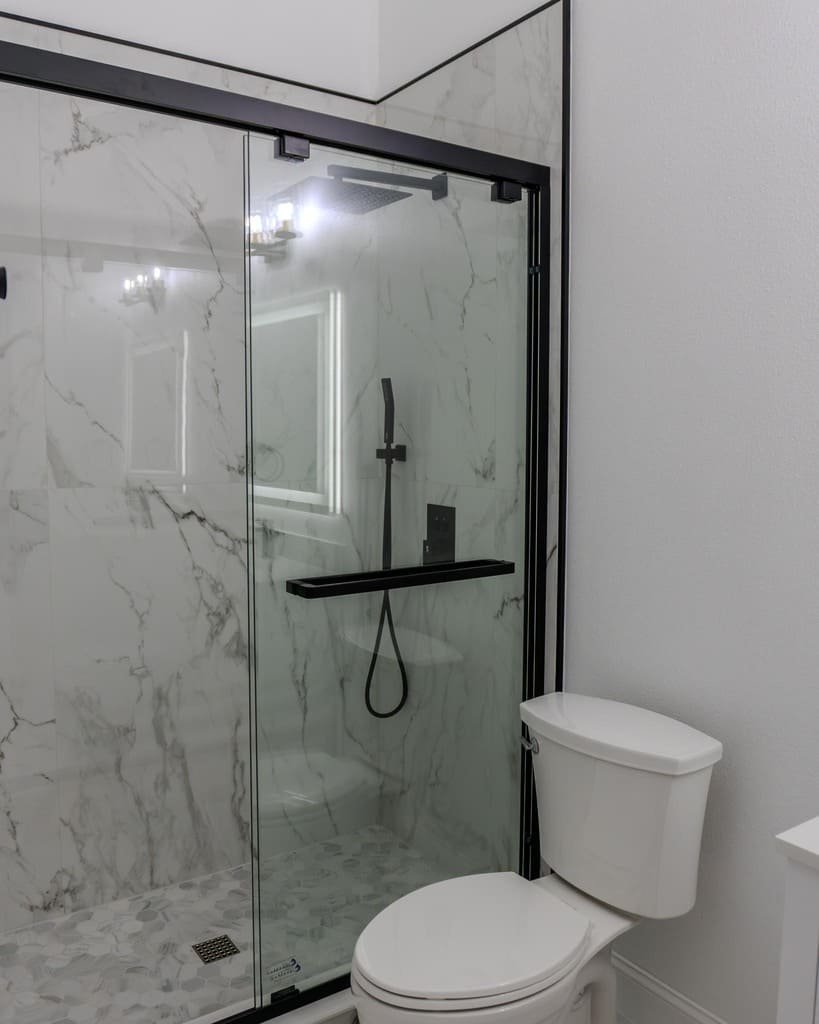 This bathroom remodel blends clean lines with bold contrast, creating a modern and timeless space designed for everyday comfort and long-term value. Neutral marble-look surfaces paired with matte black details deliver a refined, high-end finish.