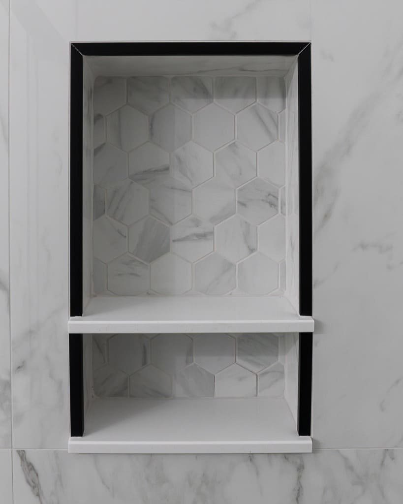 - Built-in shower niche with coordinated accent tile