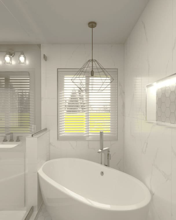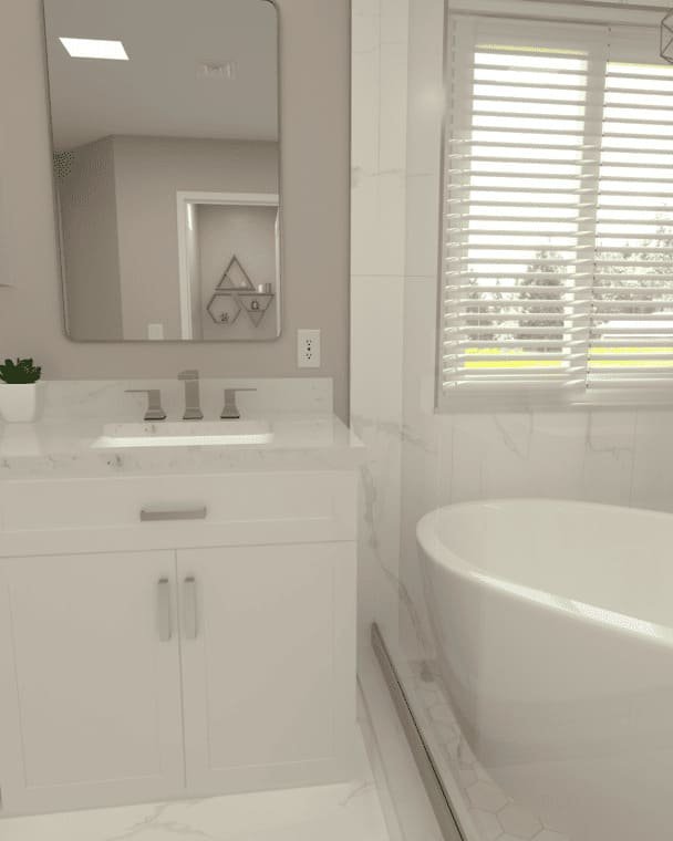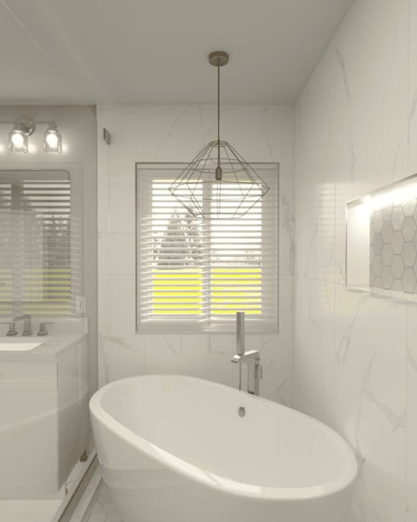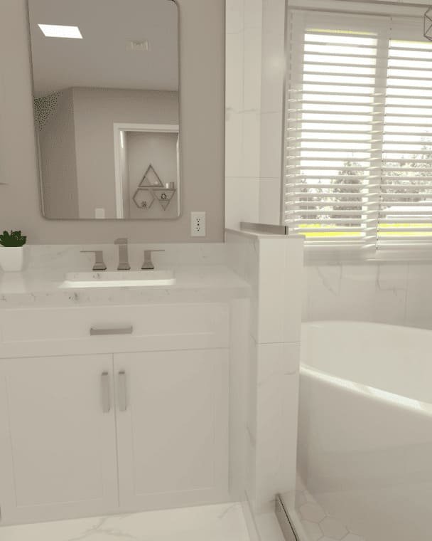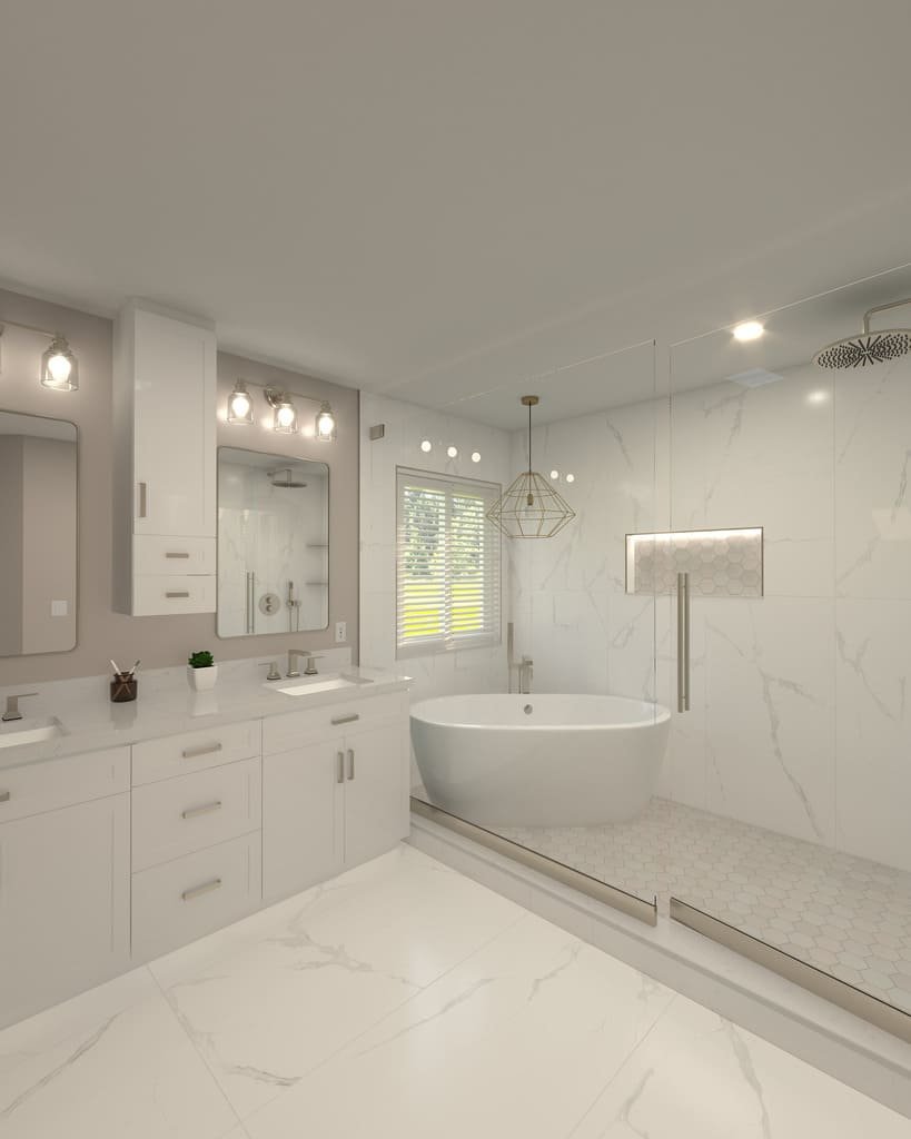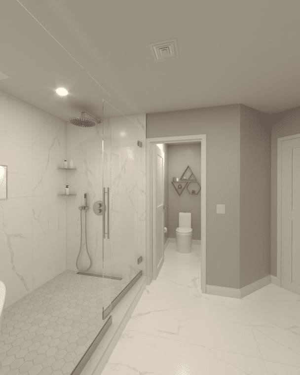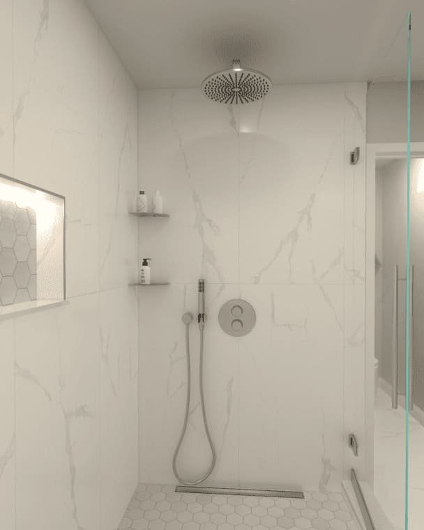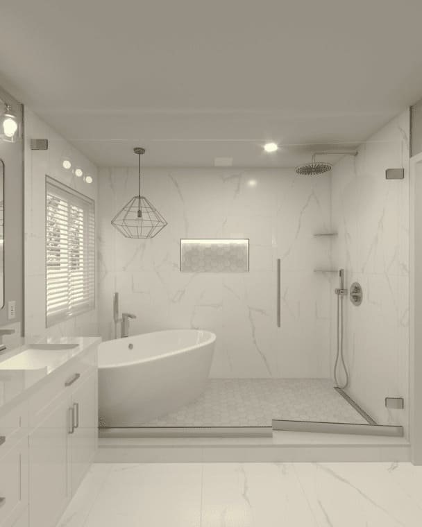 This design represents the perfect union between minimalist aesthetics and detailed engineering. The proposal features large-format porcelain with continuous Calacatta veining, achieving an unmatched sense of spaciousness and cleanliness. The integration of a walk-in shower with a linear drain and a freestanding soaking tub creates a private spa environment, where every element—from the brushed nickel fixtures to the LED-lit niches—has been strategically placed to maximize comfort.