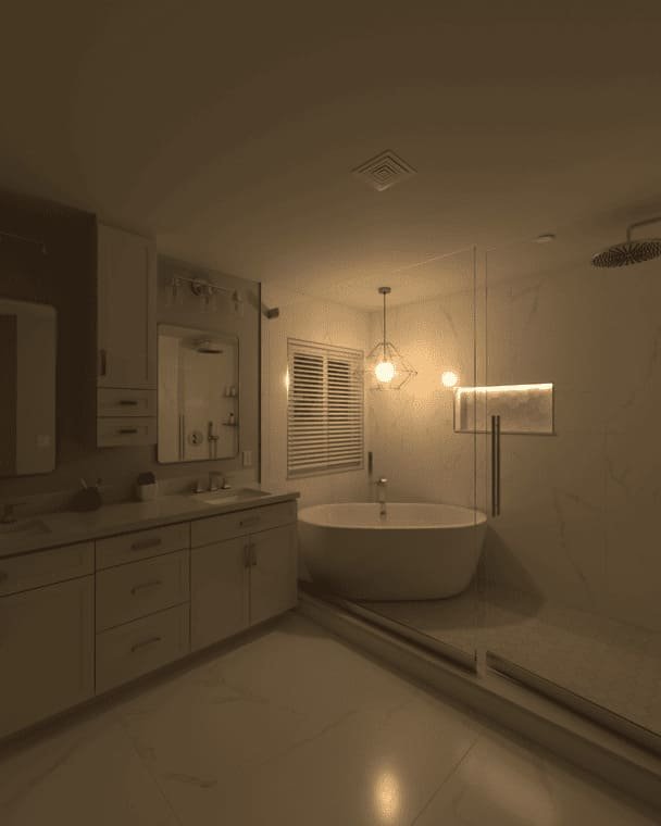 • Lighting Mastery:It demonstrates how LED lighting in niches and mirrors transforms the room’s atmosphere.