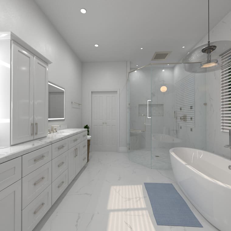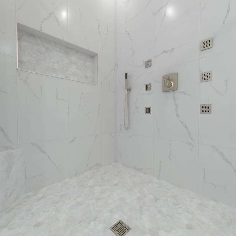 This project elevates bathroom remodeling to an experience of high-end engineering and luxury. The centerpiece is a large-scale walk-in shower equipped with an advanced hydrotherapy system, including body sprays, a handheld wand, and a high-flow rain shower head. The use of soft-veined white porcelain and hexagonal mosaic flooring creates a clean canvas that highlights the premium brushed nickel fixtures.